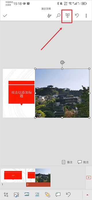 1、演示文稿编辑完成后,点击顶部播放按钮开始播放。