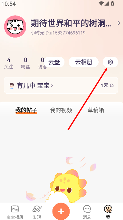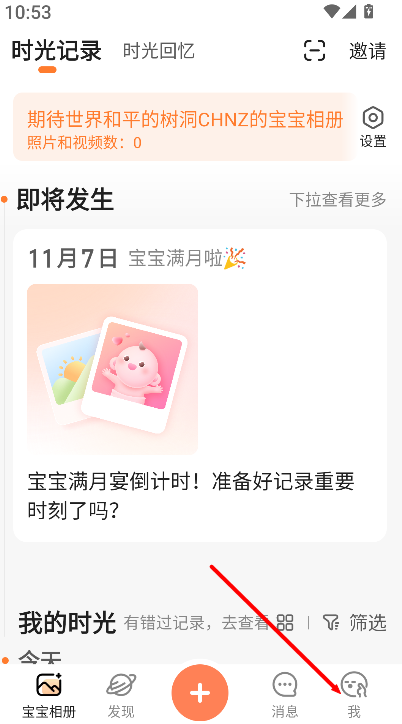 1、进入宝宝树小时光的宝宝相册首页,点击右下角的“我的”入口,可查看个人信息与账号管理选项。