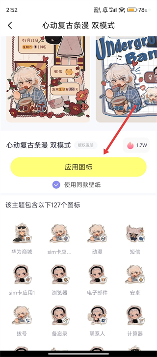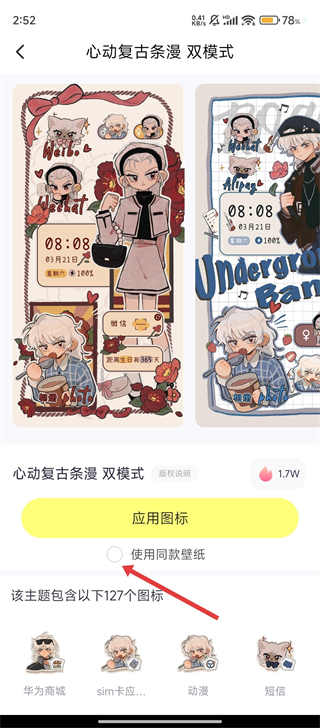 3、进入【心动复古条漫-双模式】详情页,还能勾选【使用同款壁纸】呢。