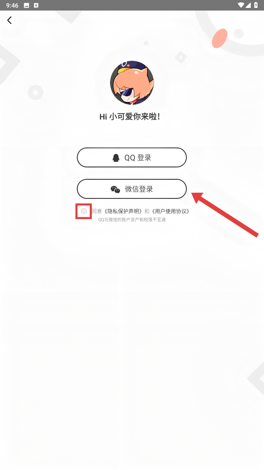 3、若选微信登录,先勾选同意【隐私保护声明】和【用户使用协议】,再点击【微信登录】哦。