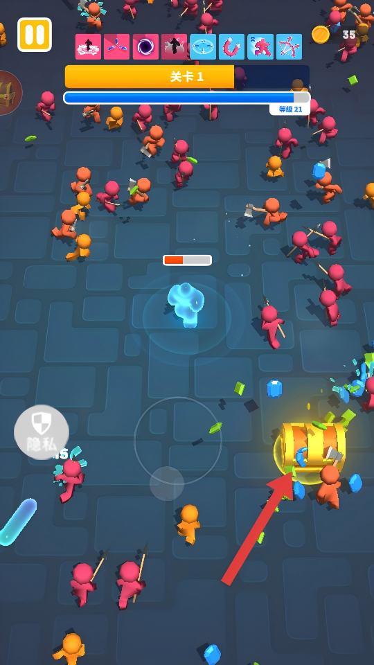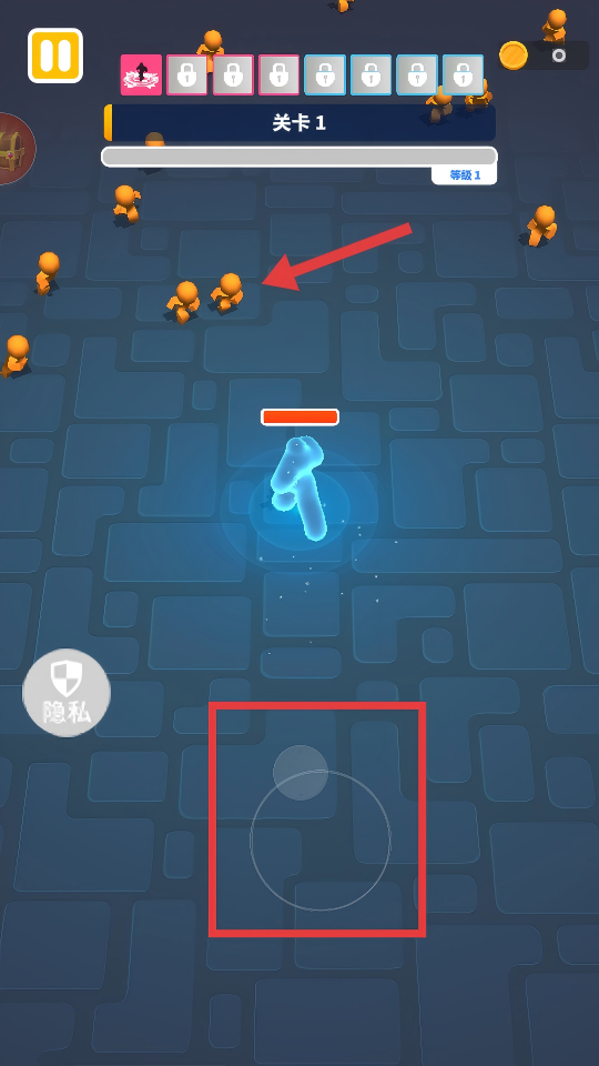 3、进入游戏场景,通过红框内的【虚拟摇杆】操控蓝色果冻英雄移动,攻击红箭头指示的【橙色敌人】。