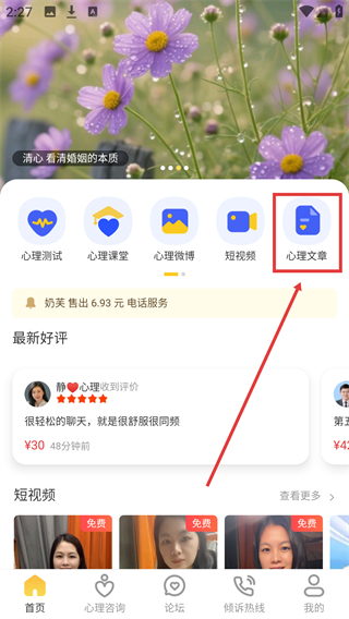 1、在首页点击【心理文章】选项,可进入心理文章专区。
