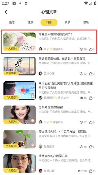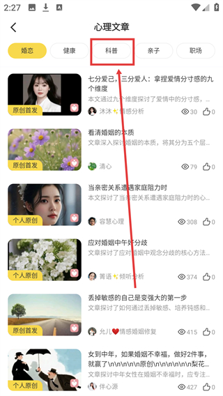 2、进入心理文章页面后,点击【科普】分类标签,即可筛选出科普类的心理文章列表,查看对应内容。