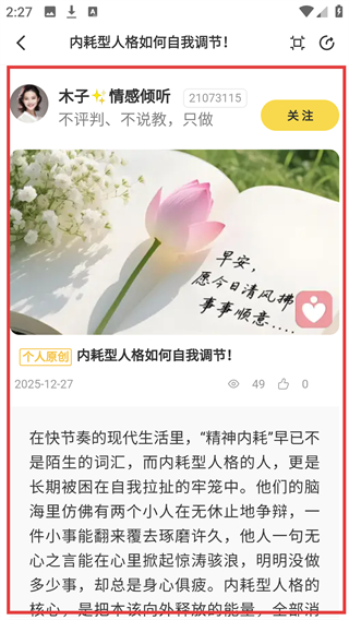 4、在文章详情页,可查看作者【木子-情感倾听】的内容,阅读文章了解内耗型人格的调节方法。