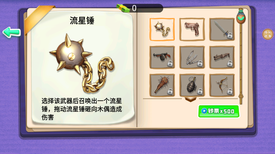 1、主界面点【开始游戏】,开启第1关;左侧【商城】浏览武器(如流星锤,拖动砸木偶)。