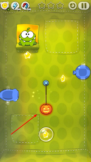 3、在割绳子场景中,切断悬挂南瓜的绳子,使其下落至指定位置,触发相关游戏机制。