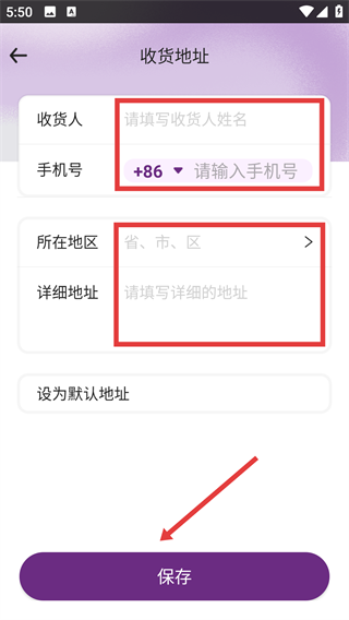 4、在新增页面,填写【收货人】、【手机号】、【所在地区】等,填写完毕后点击【保存】,就成功添加收货地址啦。