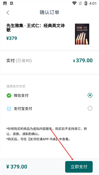 4、核对专辑及实付金额后,点击【立即支付】,完成课程购买操作。