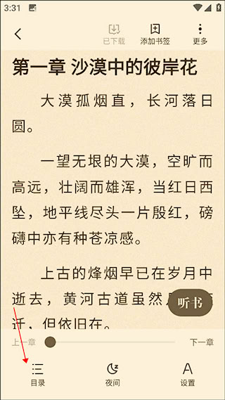 2、进入小说页面,点击任意区域,显示功能选项后查找目录