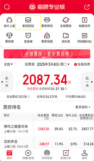 1、启动猫眼专业版应用,进入后点击界面【影院院线】;