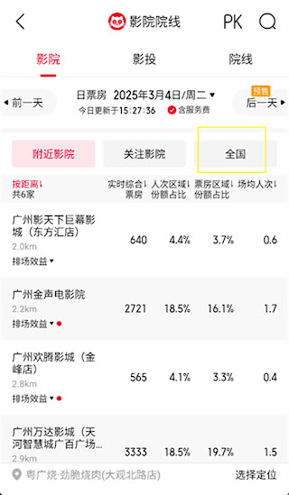2、进入影院院线功能界面,点击后方【全国】;