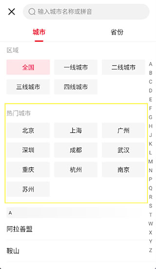 4、点击后进入城市选择界面,此处可选择想要查看的城市;