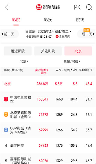 3、 排片:国内领先的排片查询工具,提前一个月查询热门档期排片,随时掌握各影片、各城市、各大影院的排片场次及占比;