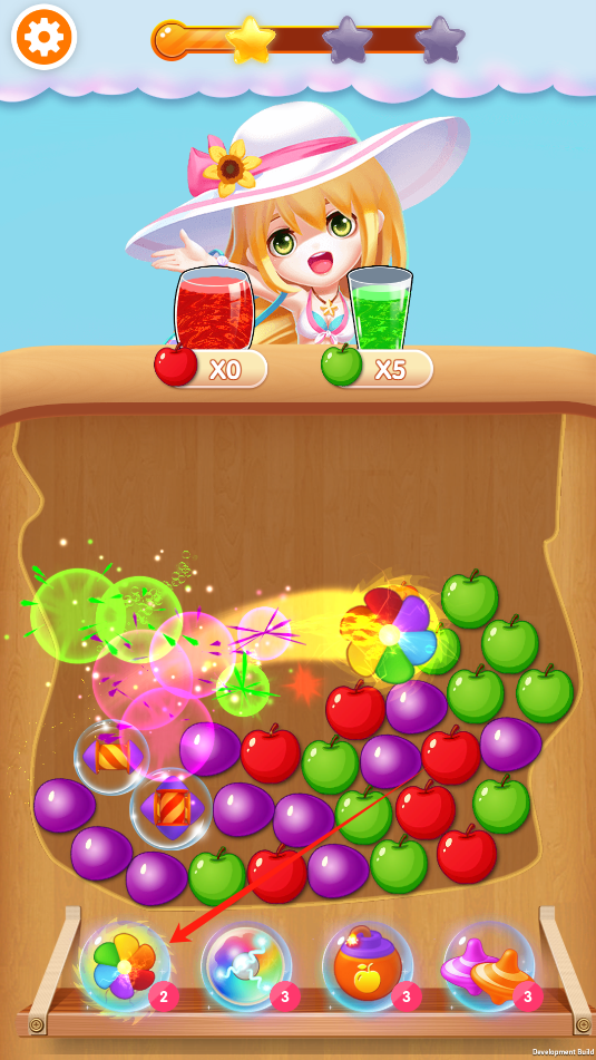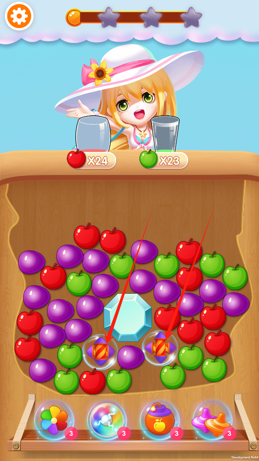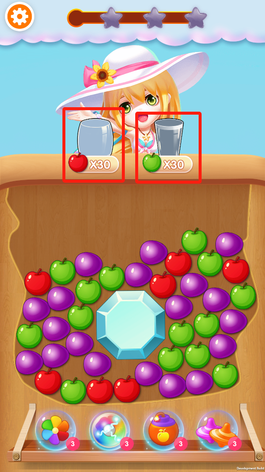 1、游戏关卡中,要消除红苹果和绿苹果各30个就可以通关,点击2个或更多的同色苹果就可以消除了。