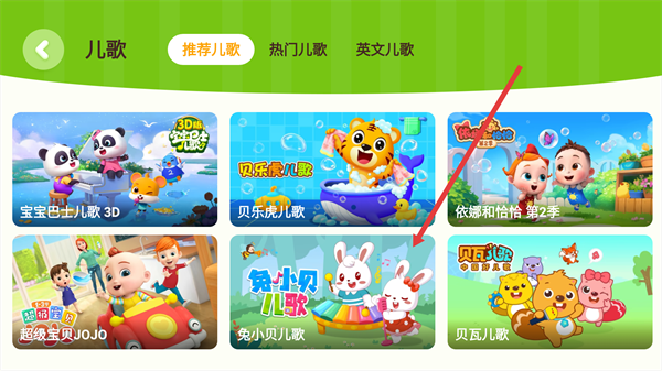 2、在儿歌板块的推荐内容列表里,选择【兔小贝儿歌】选项。