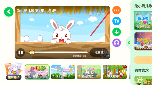 3、进入儿歌播放页面,点击右上角的更多功能按钮,调出包含播放操作的选项菜单。
