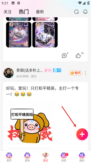 2、在【游记】页面,点击右下角红色【+】按钮。