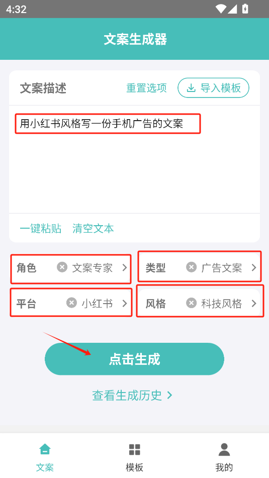 1、打开APP,在文案描述这里,写一段文案需求,根据文案内容选择角色,类型,平台,风格,点击生成。