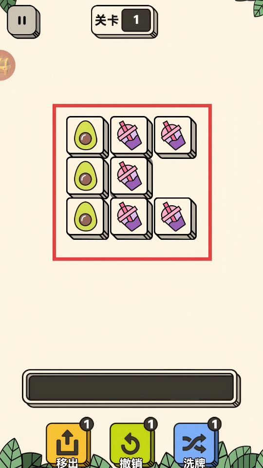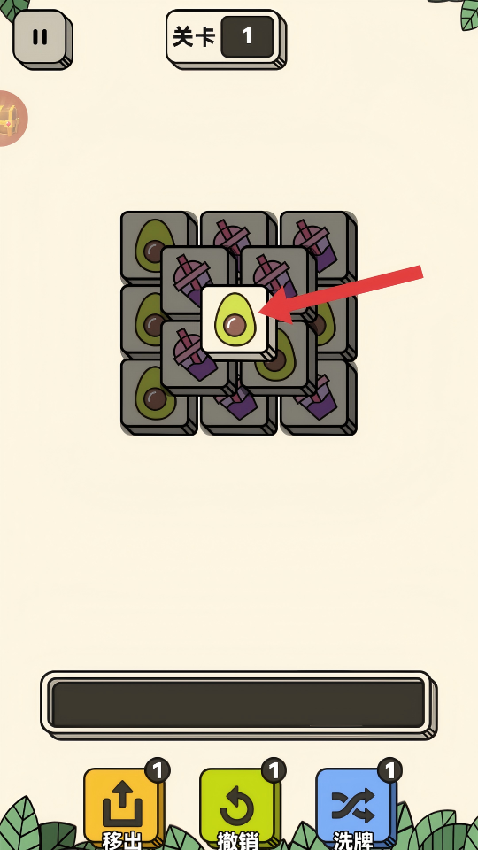 2、进入【关卡-1】后,点击【红箭头】所指的方块,将其移动到下方收集栏,凑齐三个相同图案即可消除。