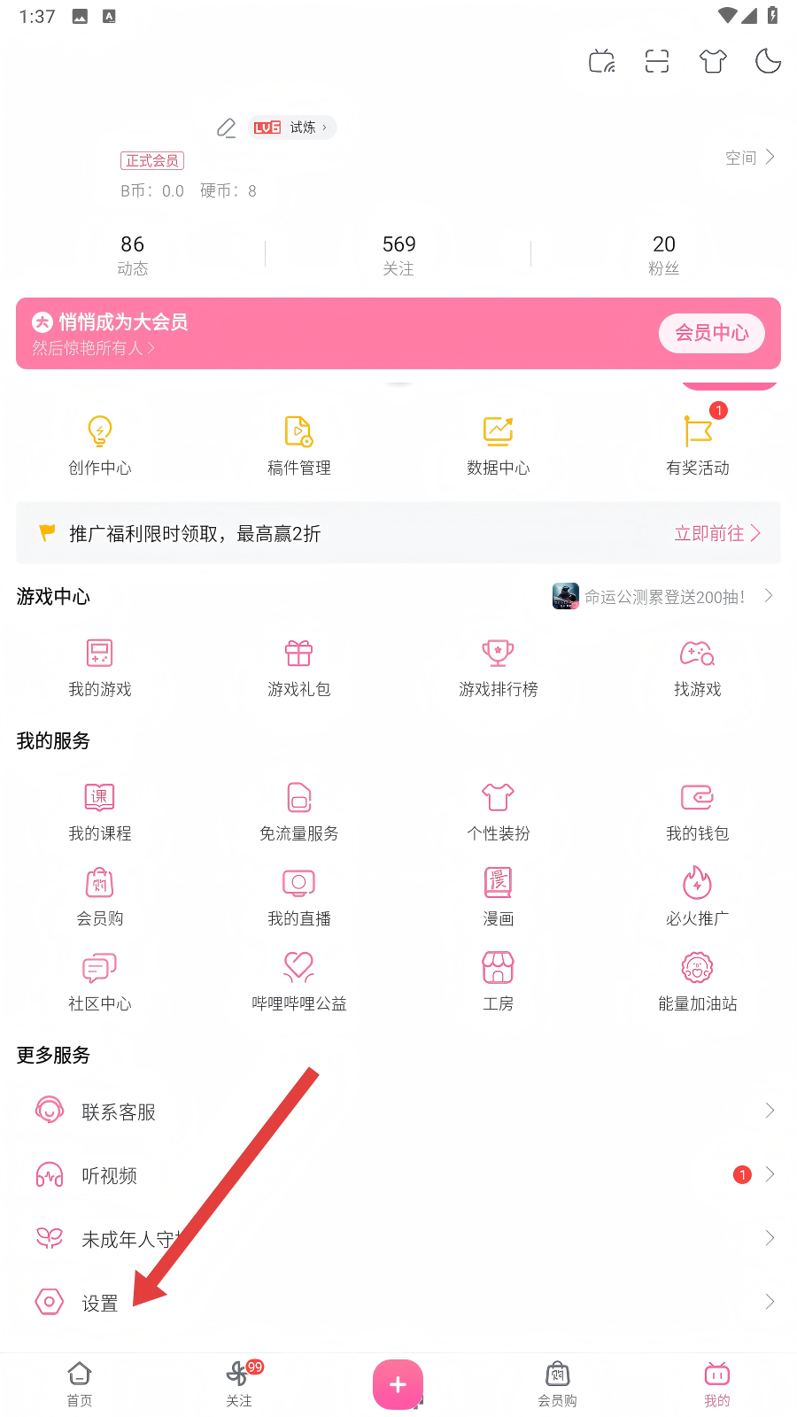 1、打开哔哩哔哩App,点击底部【我的】,再点击进入设置页面哦。