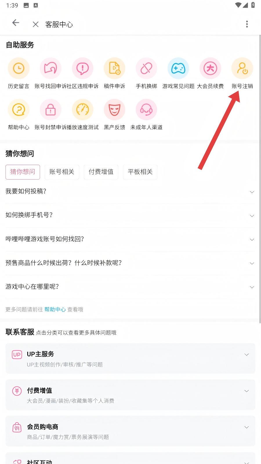 3、进入客服中心后,在自助服务里找到【账号注销】选项,点击它就可以进入账号注销流程咯。