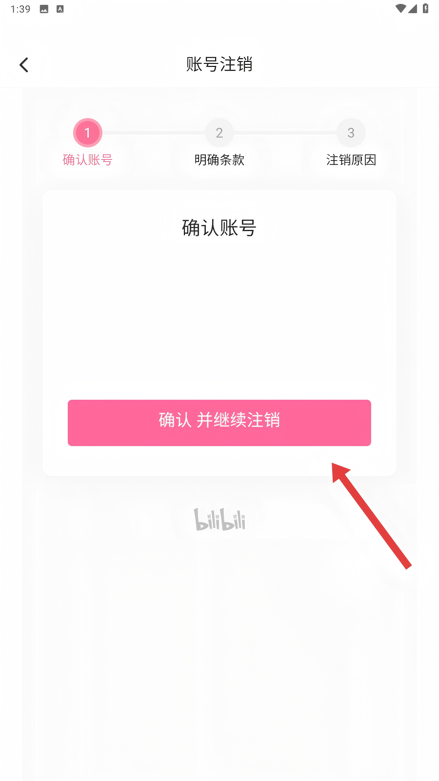 4、到了账号注销页面,确认账号无误后,点击粉色的【确认-并继续注销】按钮,就能继续后续注销步骤啦。