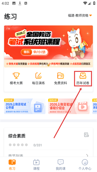 1、在【练习】页面,找到功能入口里的【历年试卷】选项并点击,可进入对应板块查看各类考试试卷。