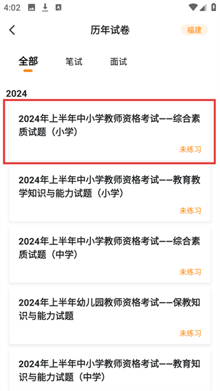 2、进入【历年试卷】页面后,找到【2024年上半年中小学教师资格考试--综合素质试题(小学)】条目,点击可进入答题页。