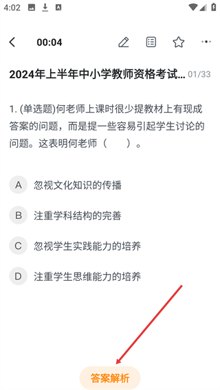 3、进入试题答题页后,可作答题目,完成后找到页面中的【答案解析】按钮,点击可查看题目解析。