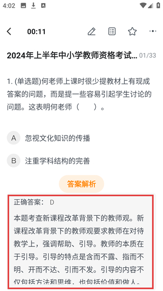 4、点击【答案解析】后,会展示该题的正确答案及详细解析内容,帮助理解题目对应的知识点。