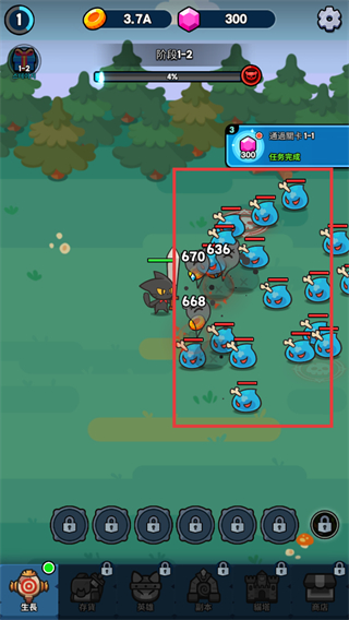 1、战斗中优先攻击蓝色小怪,完成【关卡1-1】任务可获得【钻石】300,助力后续成长强化。