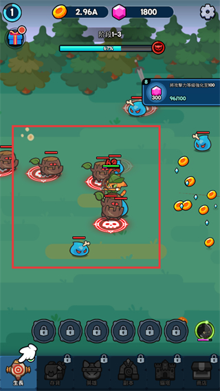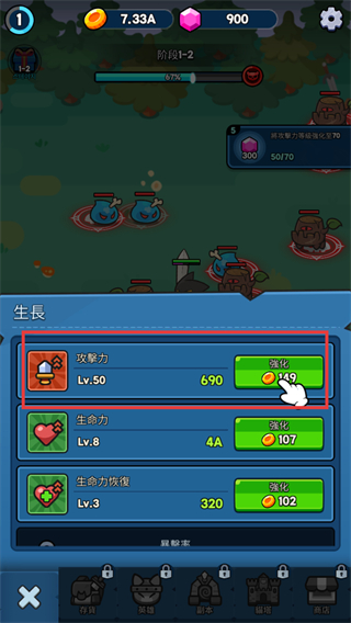4、继续强化【攻击力】至100级,完成任务获取奖励,轻松击败树桩类敌人。