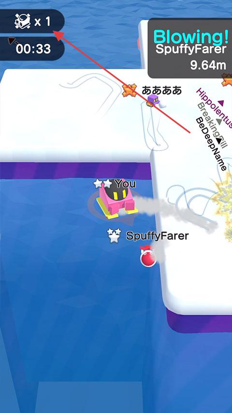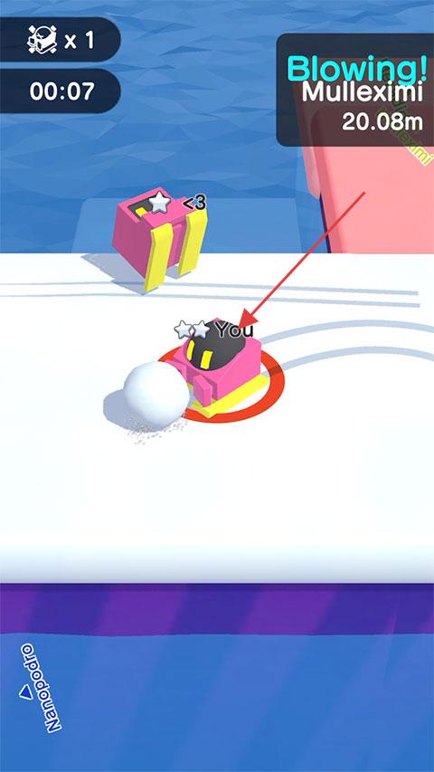 2、游戏中操控角色滚雪球,留意界面提示如【Blowing!】,把握时机和方向,让雪球不断变大以获取优势。