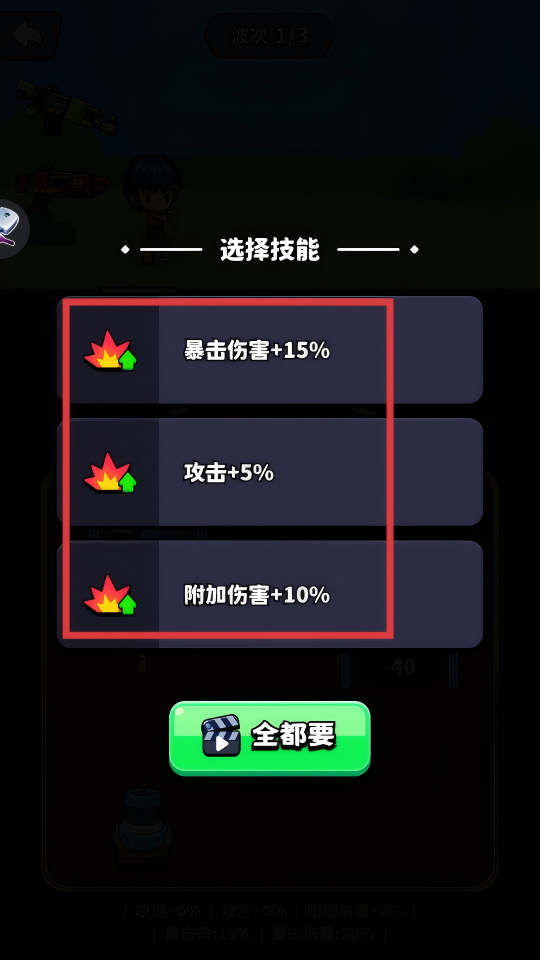 3、出现【选择技能】界面时,从红框内的【暴击伤害+15%】【攻击+5%】【附加伤害+10%】等技能中合理选择。