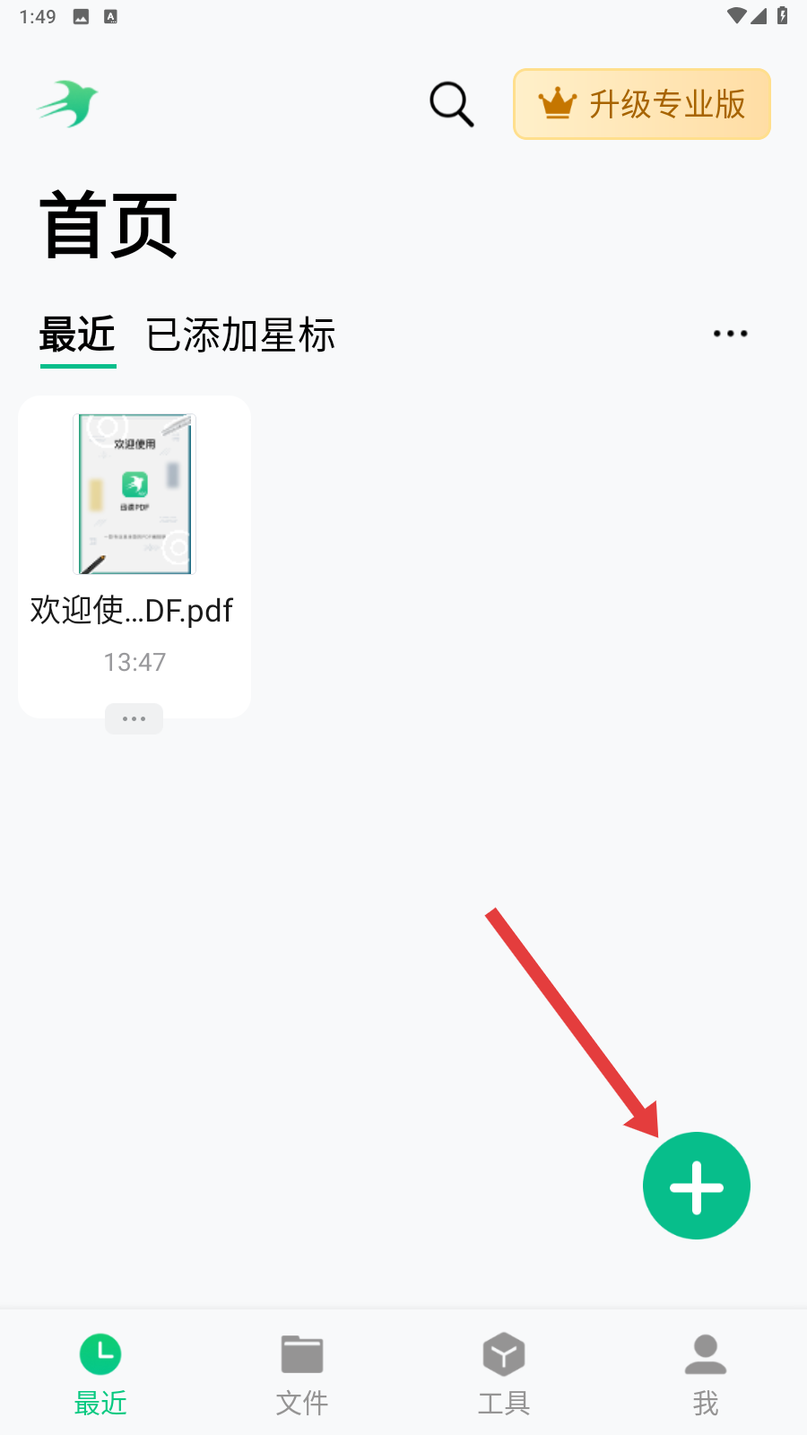 1、在迅读PDF【首页】,点击右下角绿色【+】按钮,进入文件上传流程哦。