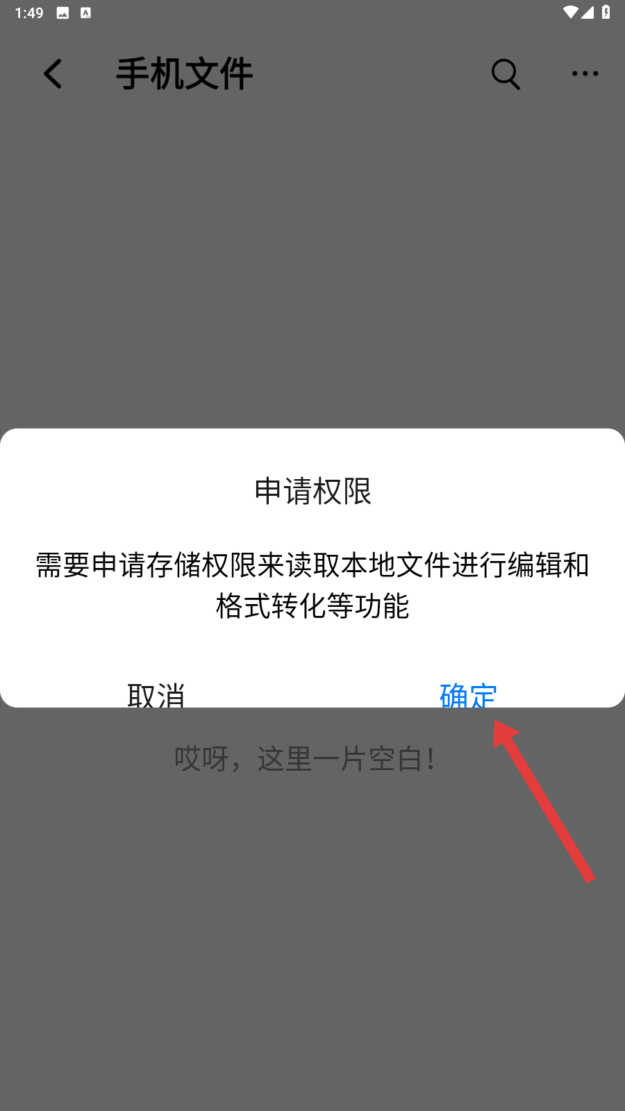 3、遇到【申请权限】提示时,点击【确定】,获取存储权限以便读取本地文件哦。