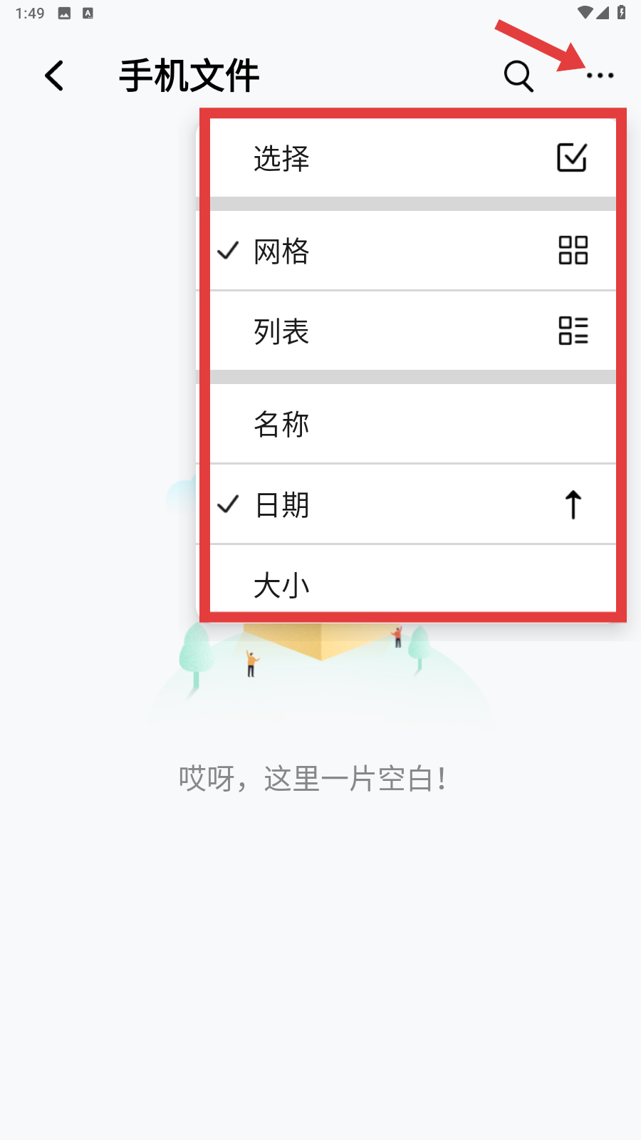 4、进入【手机文件】界面后,可点击右上角【…】,根据需要筛选文件显示方式,之后点击文件即可上传呢。