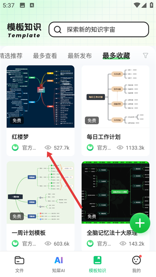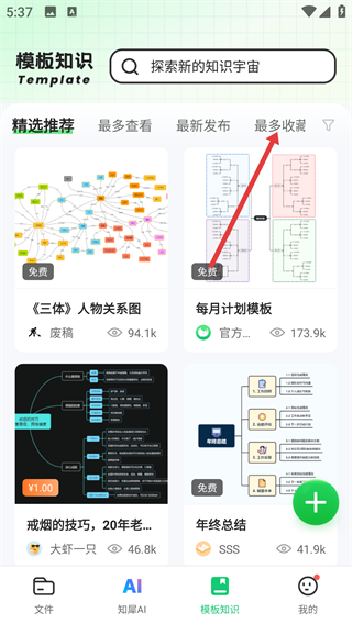 2、在模板知识页面,点击【最多收藏】标签,查看最受青睐的思维导图模板呀。