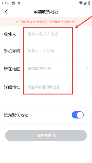 4、依次填写“收件人”“手机号码”“所在地区”“详细地址”等信息,确认后点击【保存并使用】按钮。