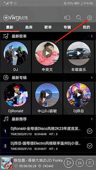1、启动清风 DJ 音乐网 APP 官方版,抵达主界面后,点击右上角形似 “齿轮” 的图标。