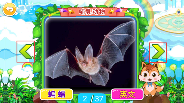 3、点击左右箭头切换动物,查看【蝙蝠】详情,探索哺乳动物图鉴。