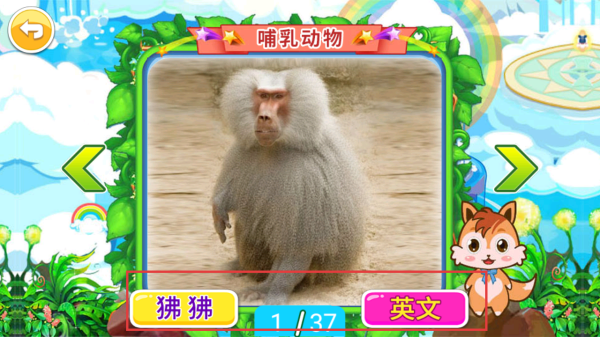 2、在动物界面,可查看【狒狒】信息,点击【英文】按钮切换语言。