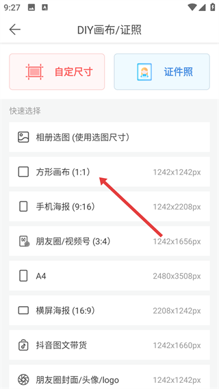 3、在【DIY画布/证照】页,我们可以选【方形画布】确定画布尺寸啦。