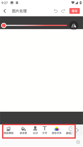 4、进入图片处理页,我们用【海报模板】等功能编辑,完成后点击【保存】就好啦。