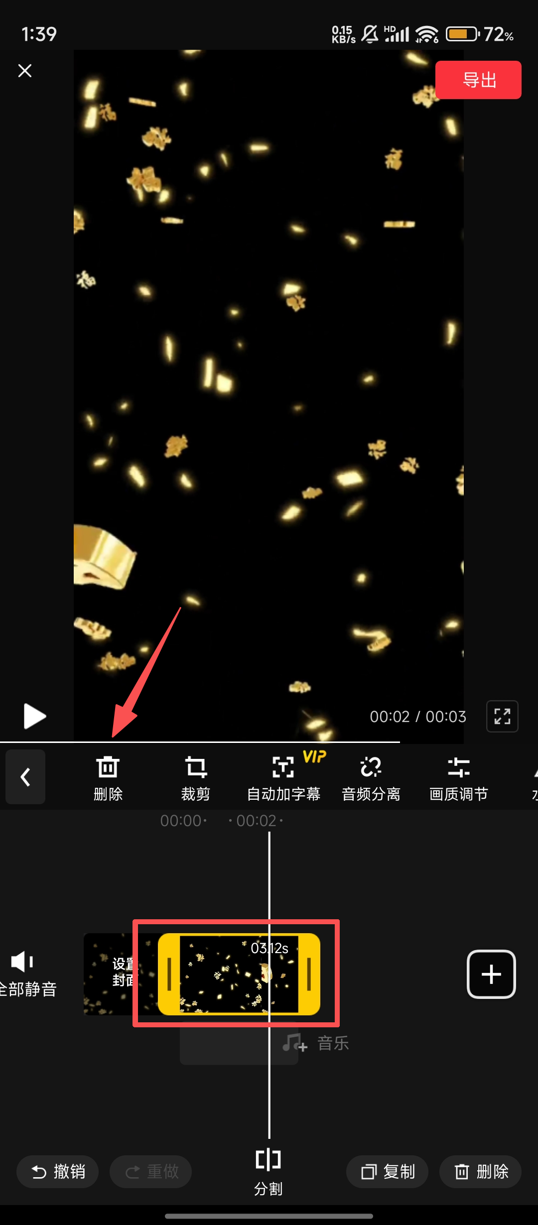 4、在剪辑界面中,选中需剪掉的视频片段,点击【删除】,就能轻松剪掉多余部分,让视频更精炼哦。