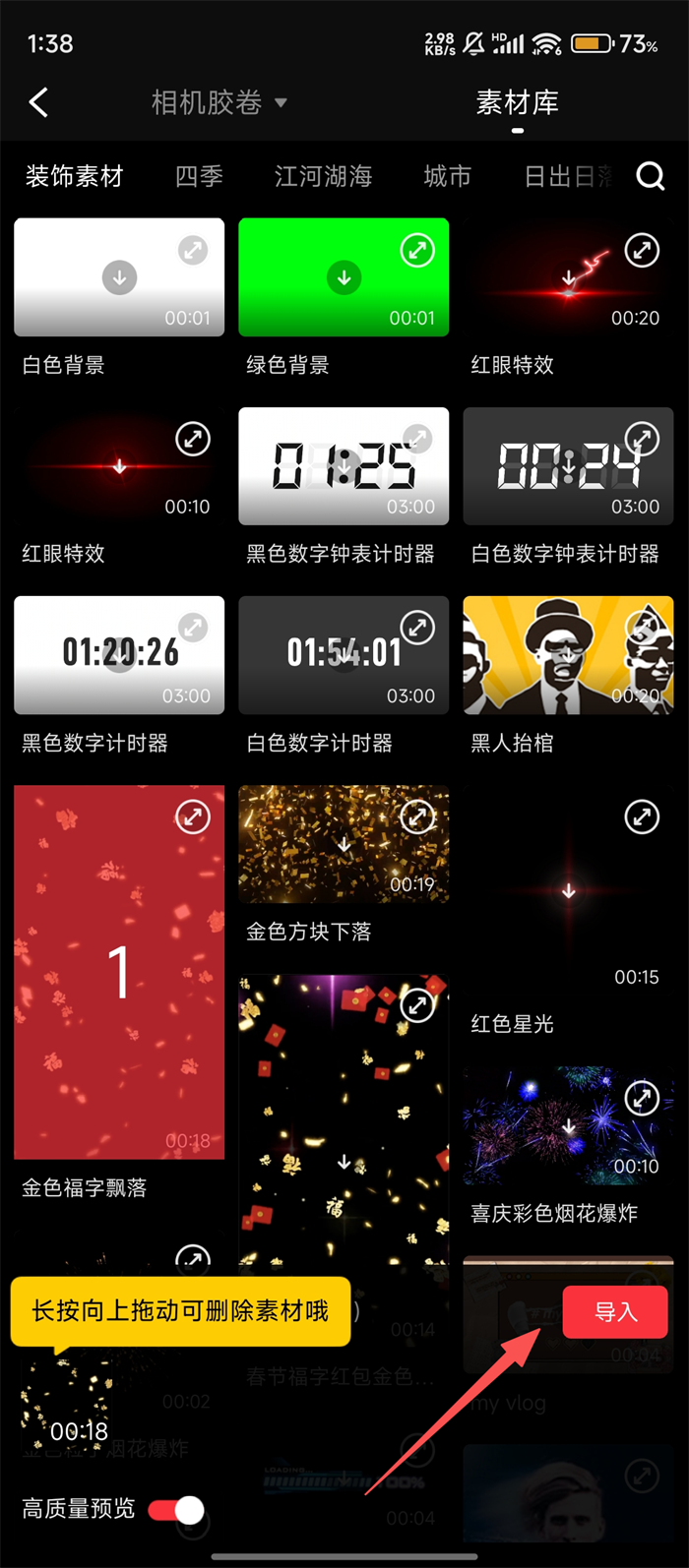 2、进入素材库后,挑选心仪素材,点击【导入】,就能将素材添加到剪辑项目中哦。