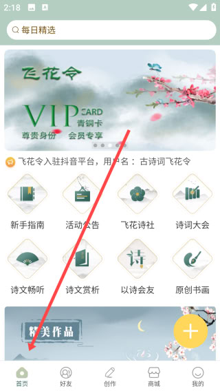 1、开启古诗词飞花令应用,点选【首页】选项。