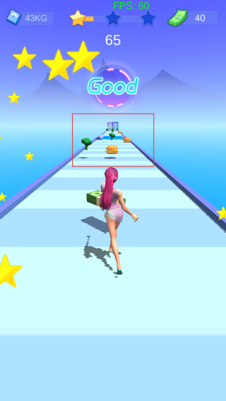 1、经典跑酷模式:跟随音乐节拍奔跑,通过左右滑动合并健康食材,控制角色体重在目标范围内到达终点,获得三星评价。