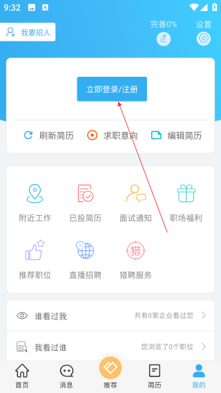 2、在个人中心点击【立即登录/注册】进入登录流程。
