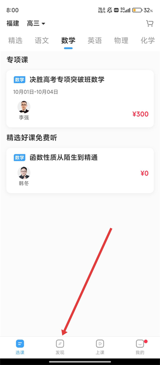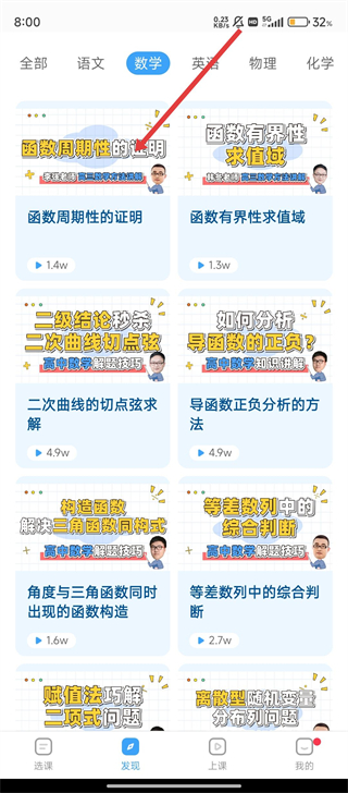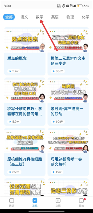 2、在【发现】页面,点击顶部【数学】标签,就能筛选出数学学科的各类课程,方便我们精准找到数学内容哦。
